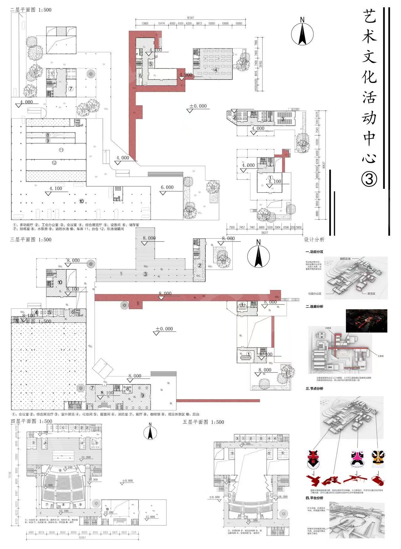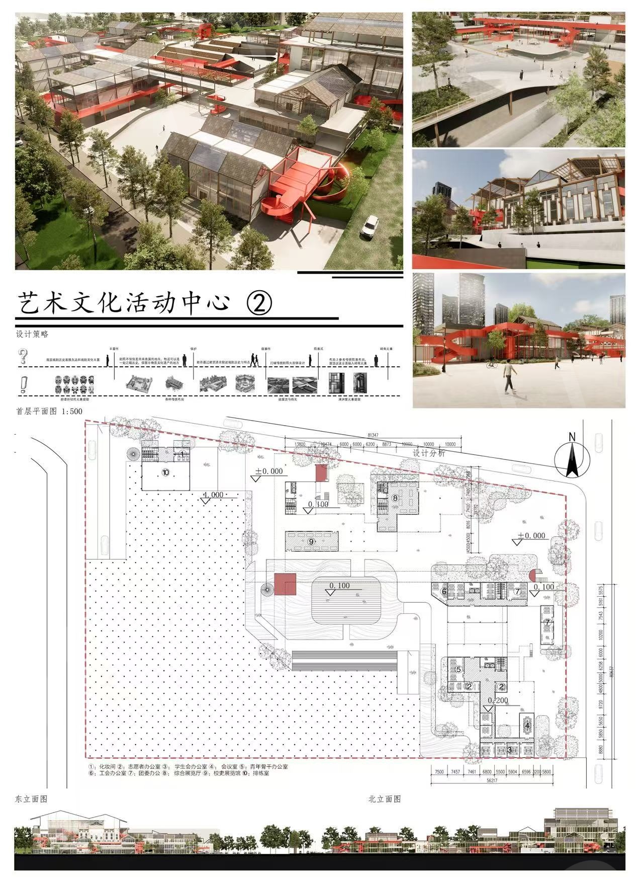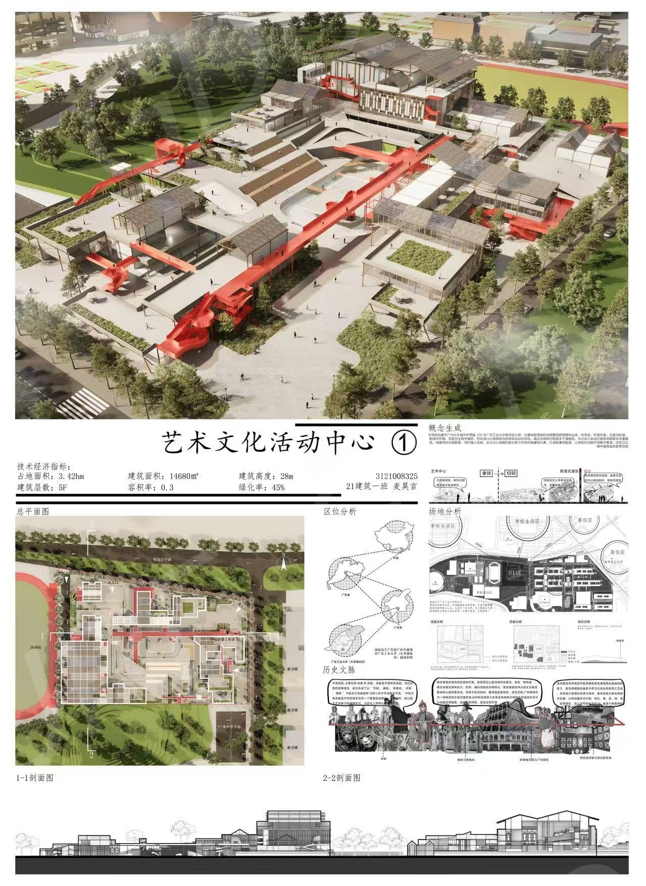 本项目位于广州市广东工业大学(大学城校区)教学区北侧,场地西南侧为山体,有高差,环境优美。北面为校道,东面为主教学楼区,西面通过山体绿地与田径场运动区相连,南边为绿地与校园主干道相连,本次设计理念是让建筑记录历史,形体上突破常规,尽量避免大体量建筑,将建筑碎分成块,错落堆叠,同时参考中国古建筑群布置,将块围合成院落,院落间通过插入连廊来联系在一起,另一方面,在节点设计,屋顶设计与立面设计上加入戏剧历史元素与传统岭南建筑元素,将连廊打造叙事性廊道,让建筑功能不局限于表演,还可以记录中国戏曲历史和岭南建筑特色等功能。